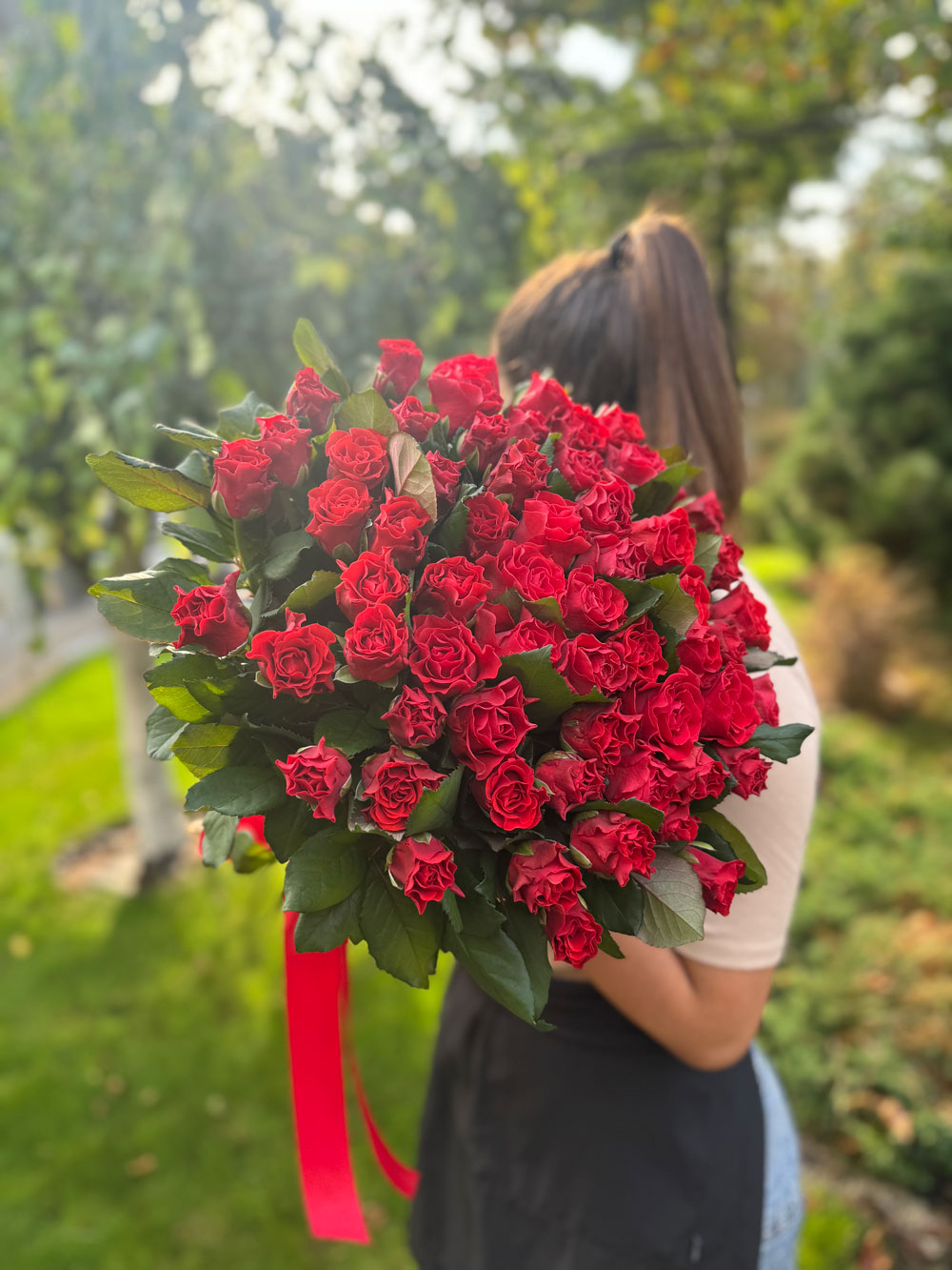Композиція акуратно зібрана та перев’язана декоративною стрічкою, що надає букету завершеного та урочистого вигляду. Такий подарунок не залишить байдужим – він створений, щоб вражати.