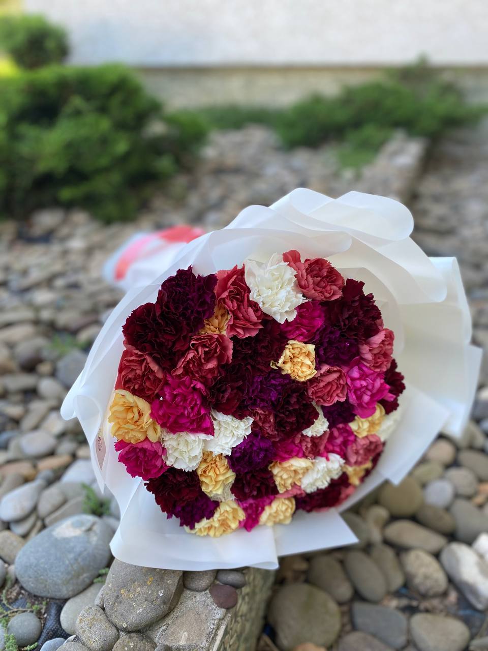Яскравий букет діантусів – насичений букет із 39 квітів, що вражають поєднанням глибоких рожевих, пурпурових, білих та жовтих відтінків. Оформлений у ніжну білу обгортку, цей букет стане виразним подарунком для коханої людини чи стильним акцентом на святі.