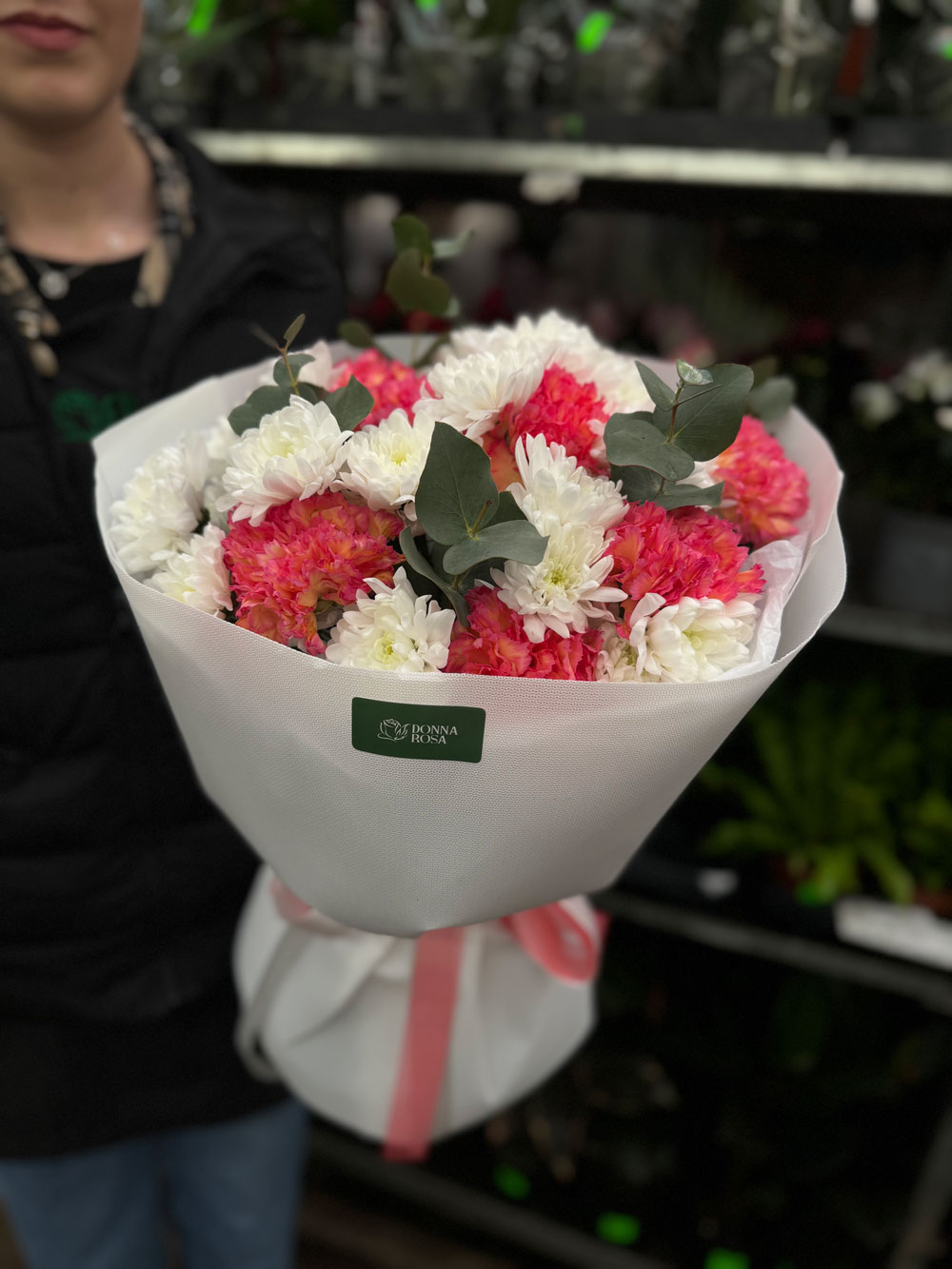 Мікс хризантеми з діантусами – чарівний букет, що поєднує 9 ніжних хризантем, 6 яскравих діантусів та 2 гілки евкаліпта. Упакований у прозору обгортку з рожевим декором, цей букет ідеально підходить для подарунка чи святкового настрою.
