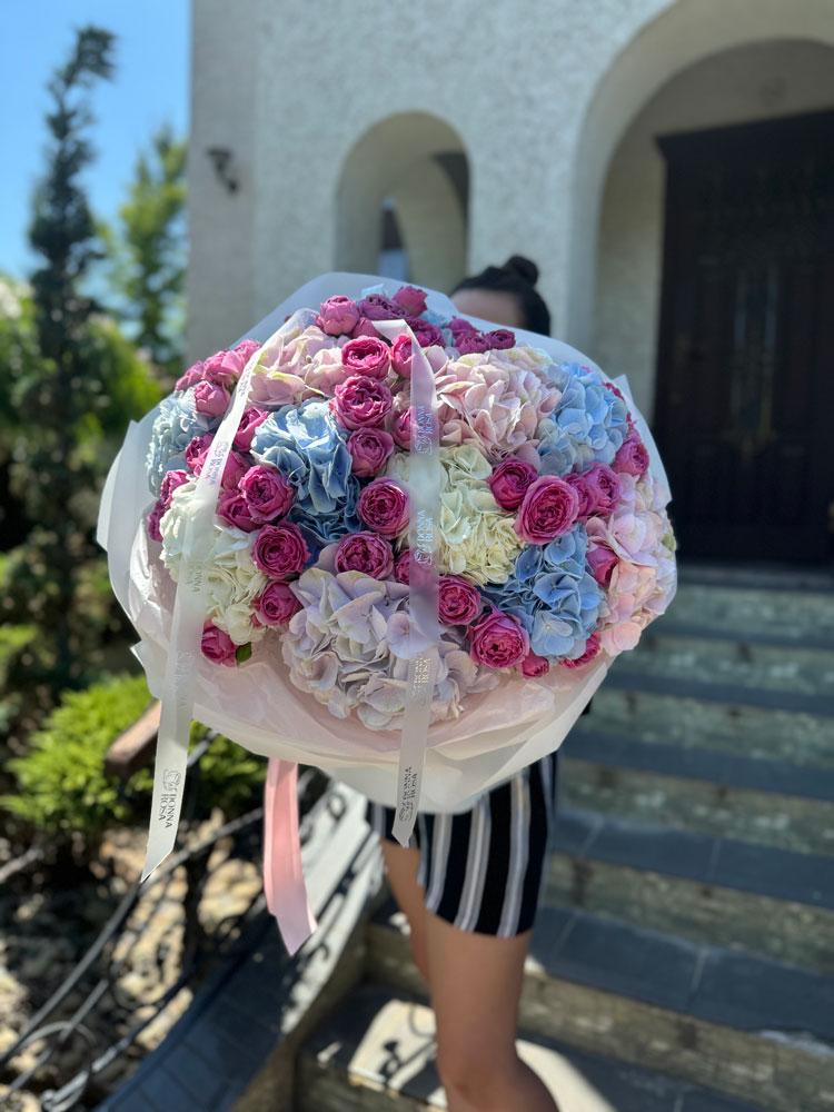 Обʼємний мікс гортензії та піоновидних  троянд – розкішний букет для особливих моментів.