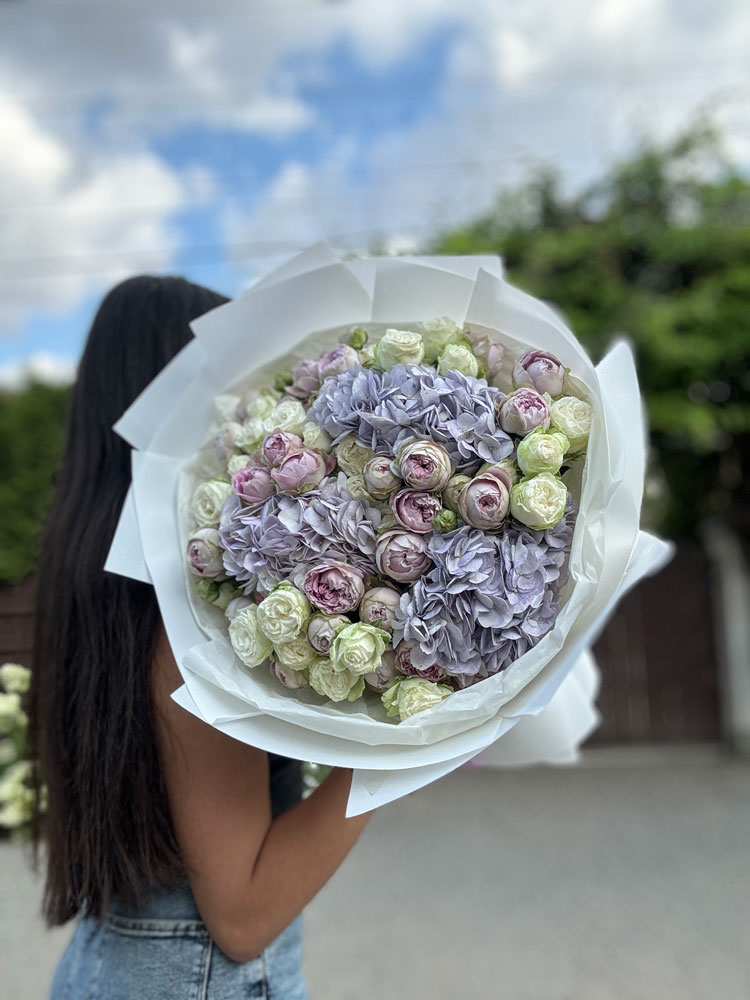 Мікс гортензії з піоновидними трояндами – розкішний букет із 3 ніжних гортензій, 7 троянд Блоссом Баблз та 9 троянд Міс Бомбастік. Поєднання пастельних відтінків і стильна біла обгортка роблять його ідеальним для романтичного подарунка чи елегантного декору.