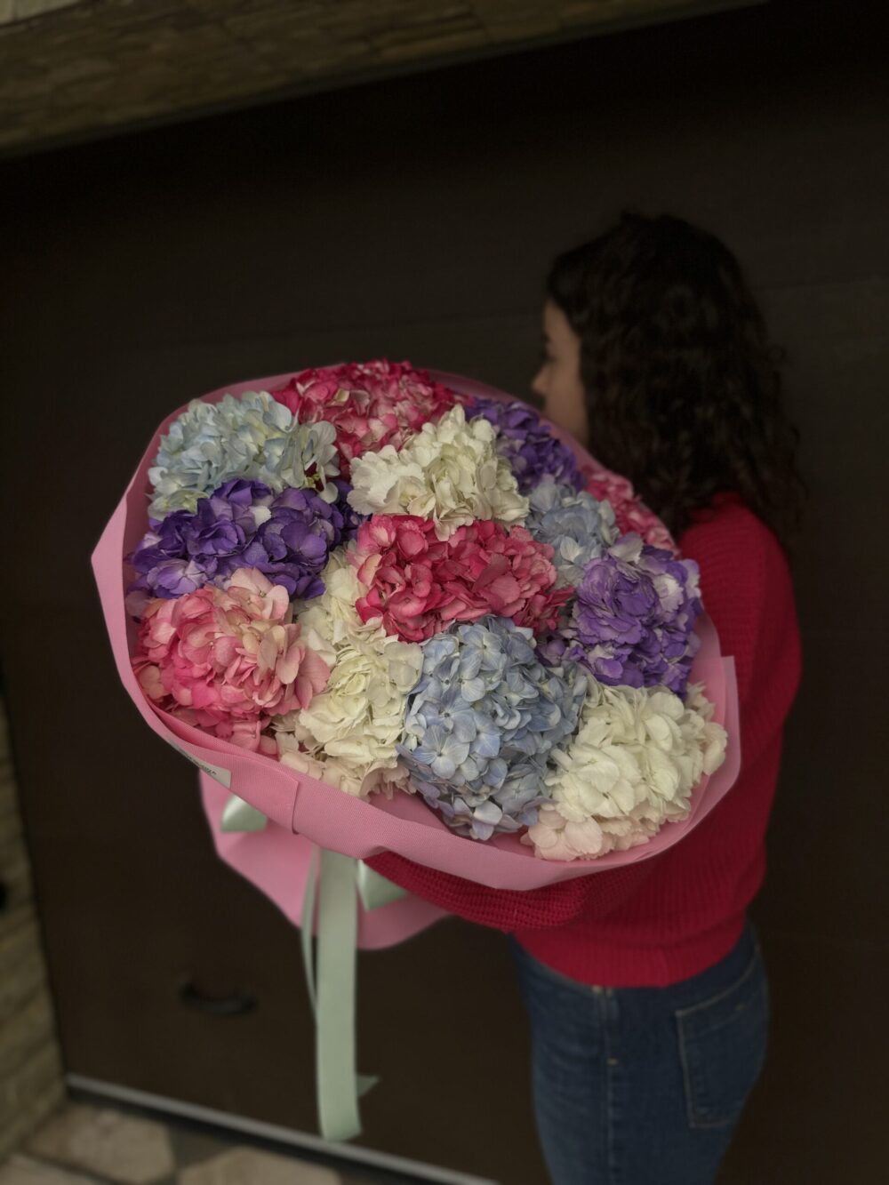 Різнокольорові гортензії – розкішний букет із 13 пишних гортензій, що поєднують ніжні відтінки від блакитного до рожевого та пурпурового. Оформлений у стильну рожеву обгортку з ніжною стрічкою, цей букет ідеально підходить для подарунка чи декору, додаючи свіжості та елегантності.