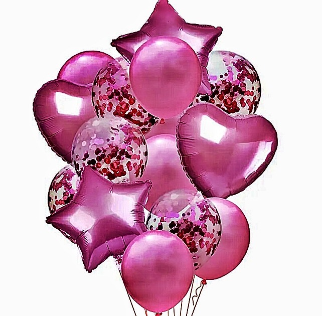 Фольговані латексні кульки з конфеті рожевого кольору, набір із 14 штук, наповнених гелієм – романтичний вибір для весіль чи дитячих свят. У набір входить: 2 фольговані зірки 45 см, 2 фольговані серця 45 см, 5 латексних кульок 25 см та 5 латексних кульок з конфетті. Ці кульки додадуть ніжності та шарму вашому заходу.